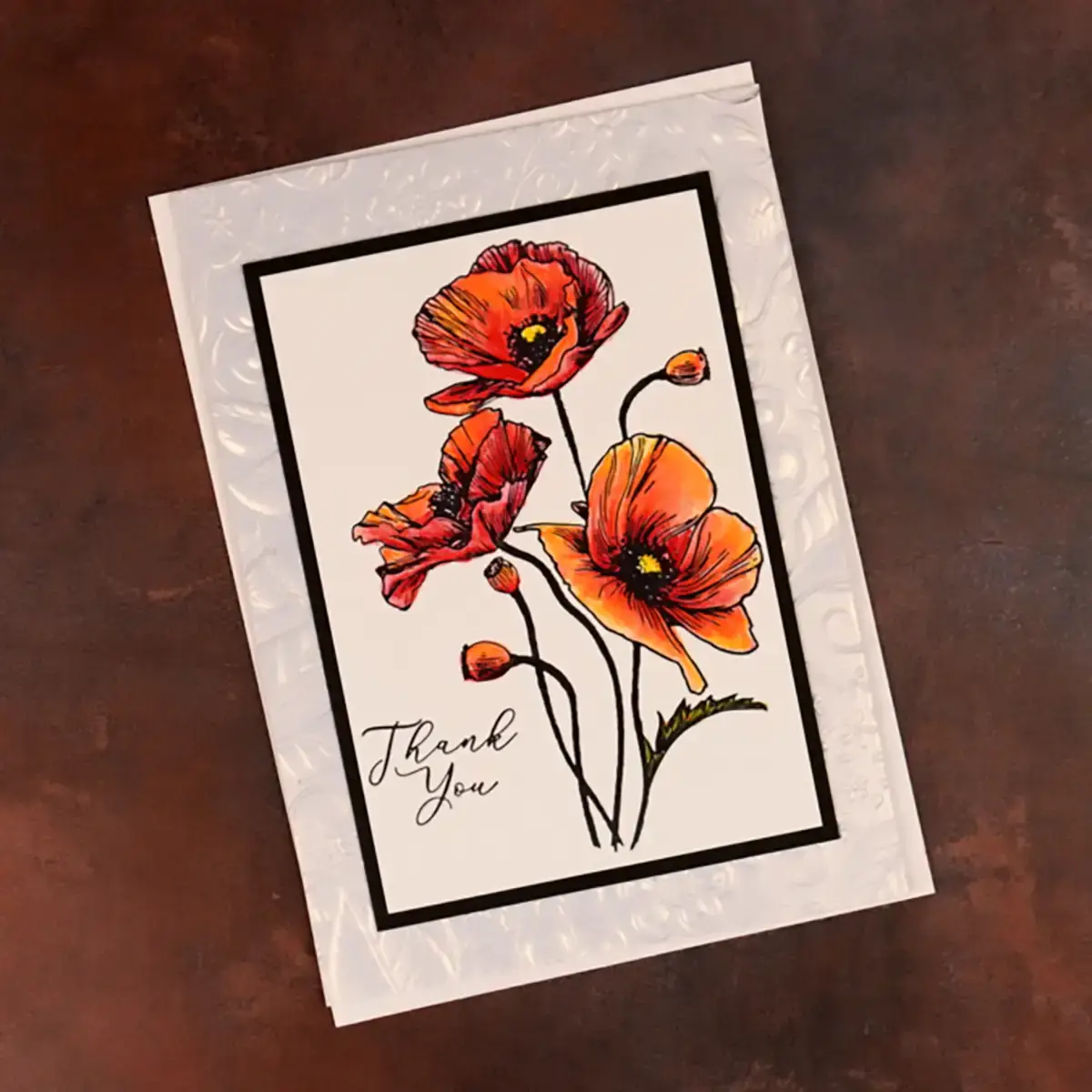 This last project features the BetterPress and the 3D Embossing Folder of the Month to produce a gorgeous thank you card. It’s pretty straight forward. The plates are pressed with black ink on white cardstock. And then, water reactive colored pencils create beautiful, vibrant poppies.
