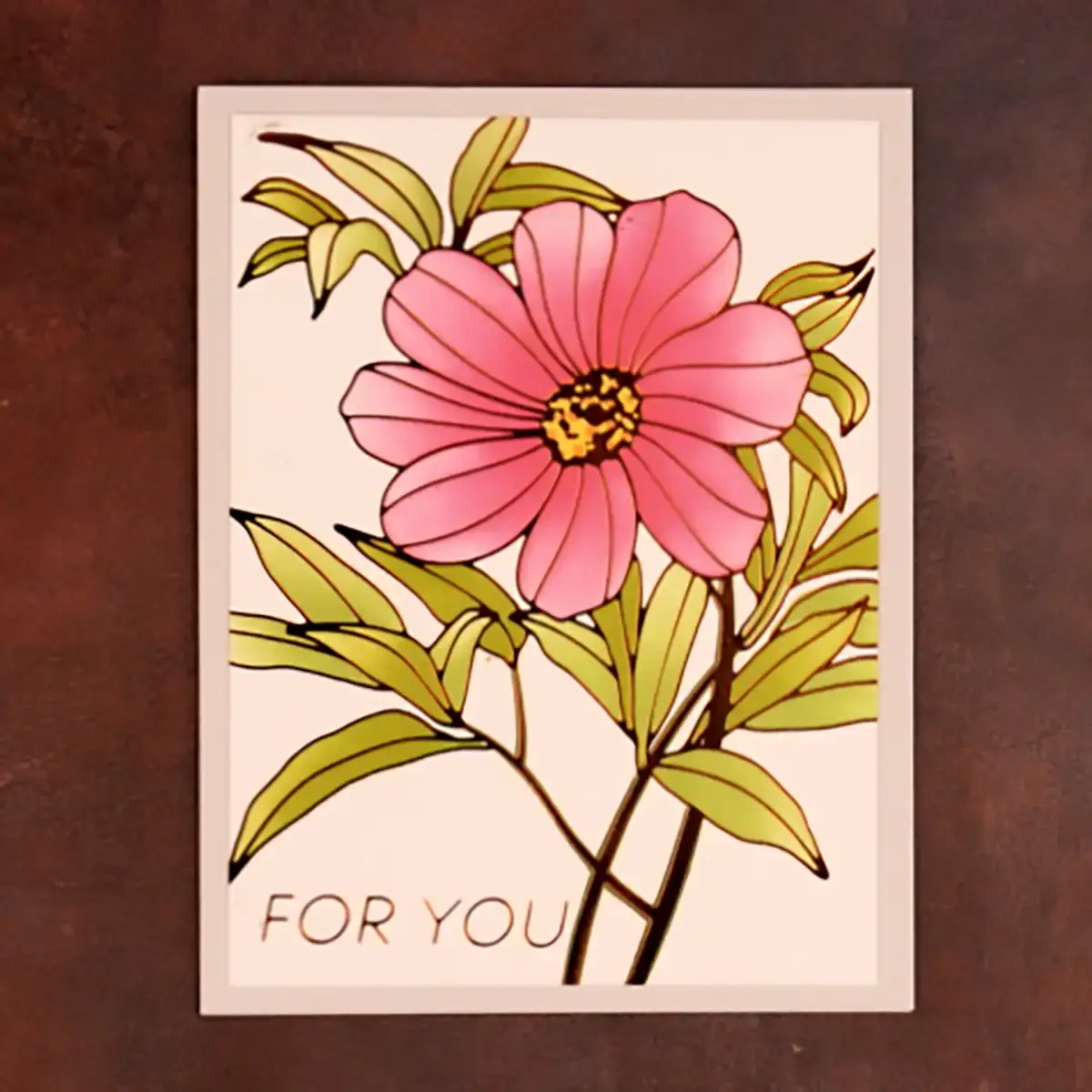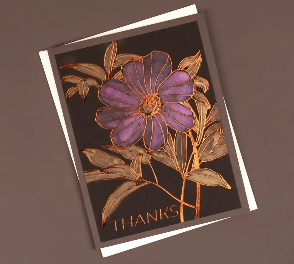 The third project also uses copper foil, but I use this month’s Stencil of the Month, Lively Floral, to color it. I like to vary pressure when stenciling to create shading and that is what I did on this card. As a result, the flower center and the bottoms of the leaves are darker. I love the idea of having stencils that coordinate with Glimmer plates. It opens up a whole new world for coloring the beautiful images created with the plates.