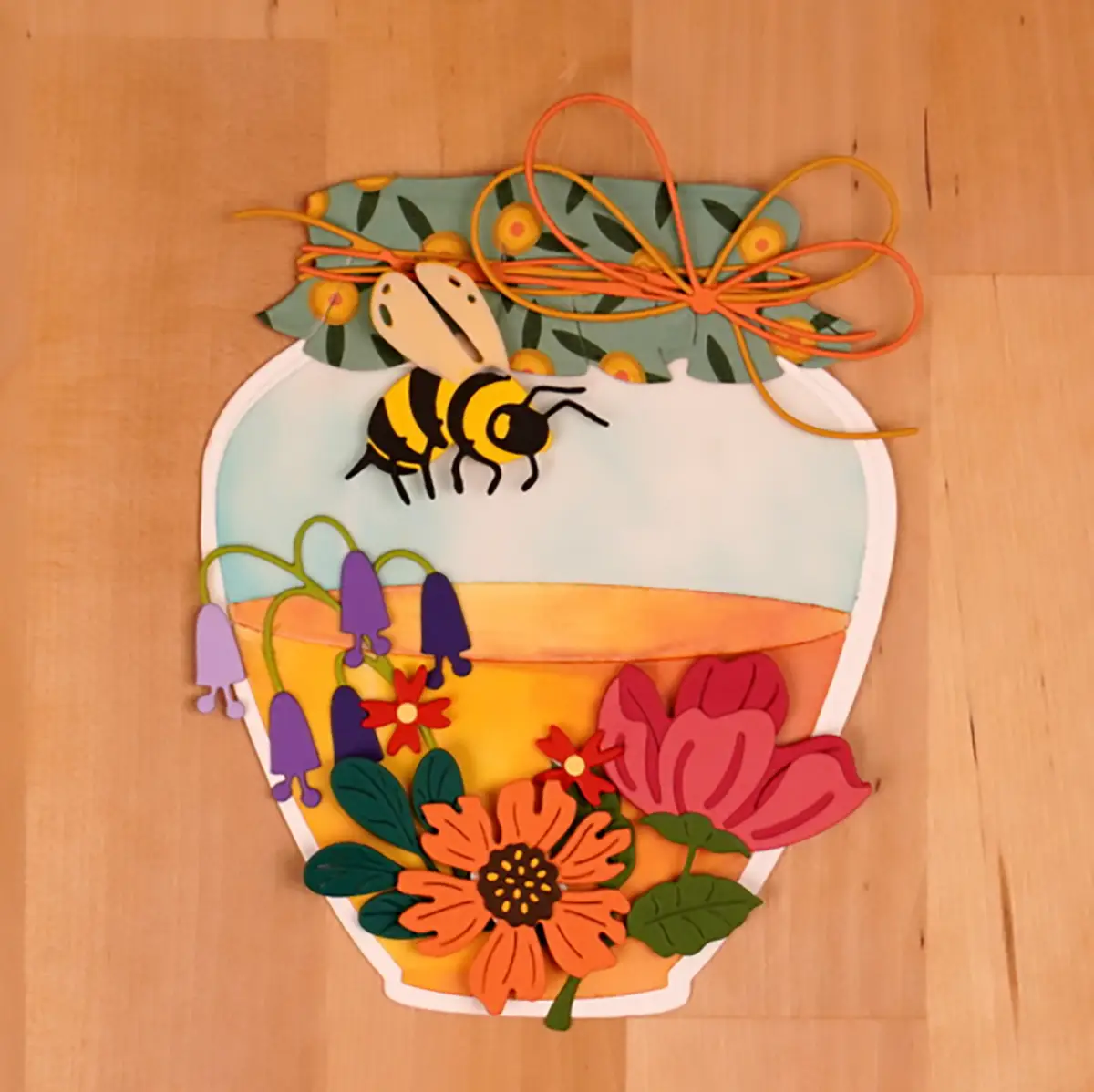 You see honey alot at fairs. And many times when you see it with the tops covered with a pretty piece of cloth. And then, it’s tied on with twine or ribbon. That is easy to replicate with patterned paper and the cool die. And, you can create additional interest by cutting two sets in two different colors of cardstock.