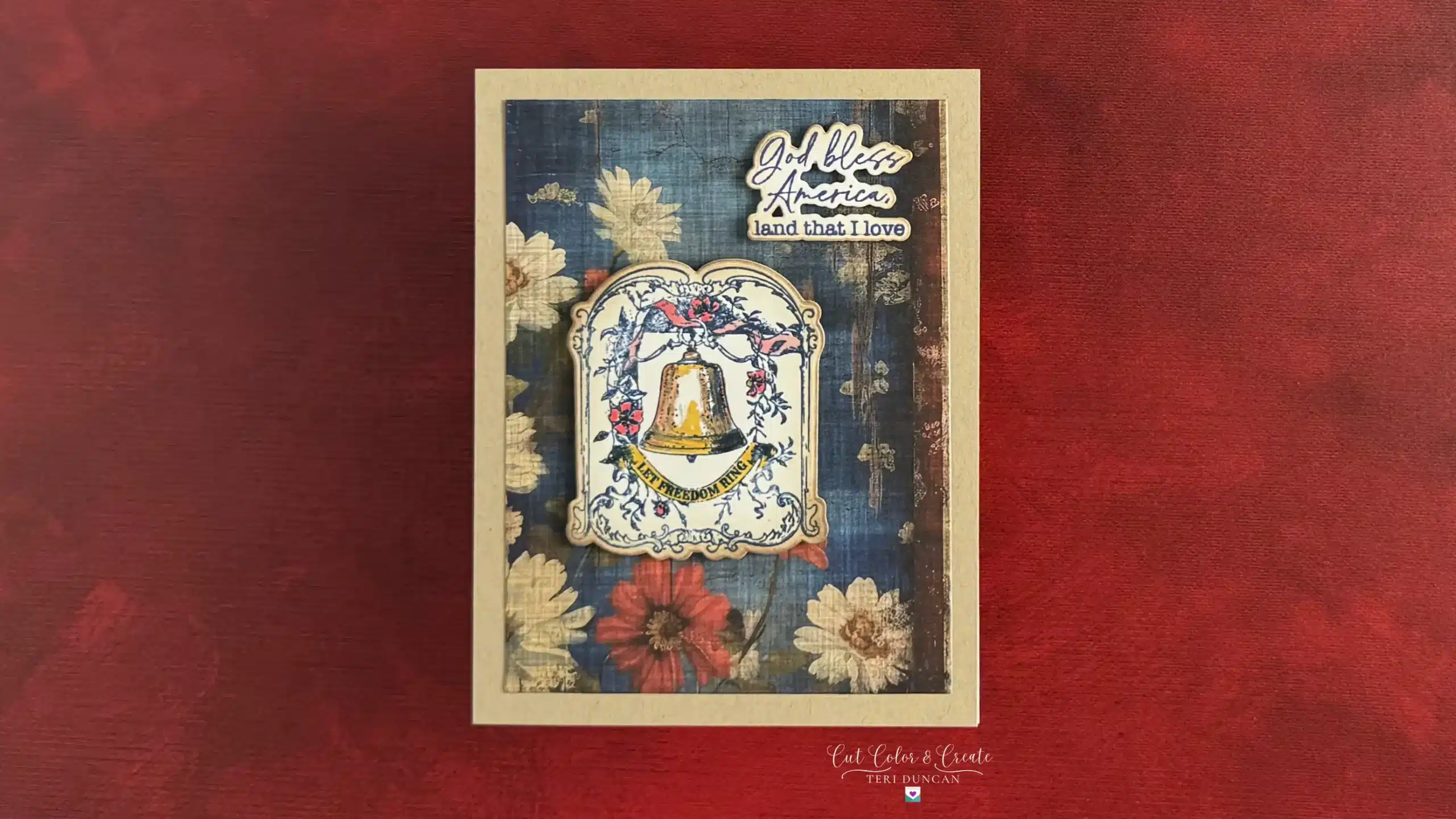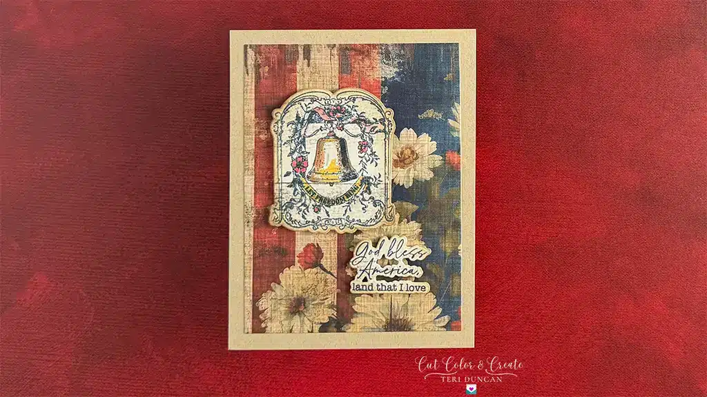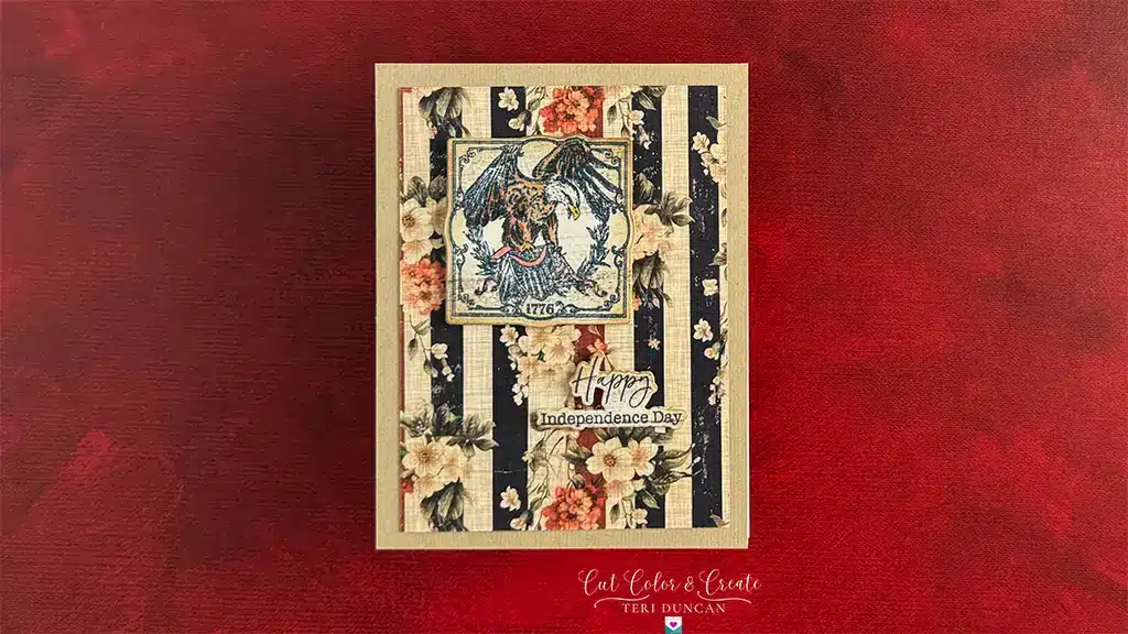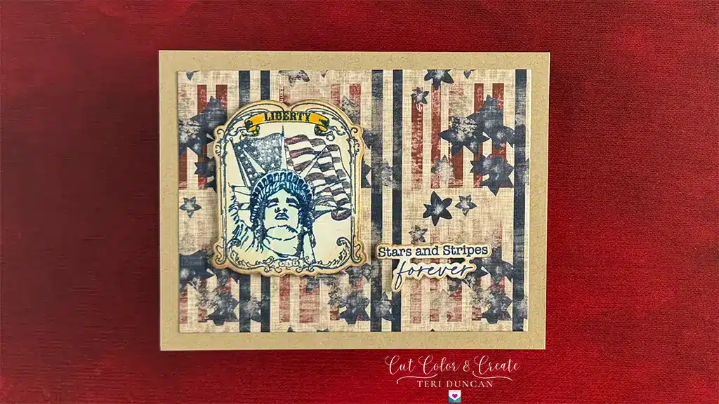 Add your layered elements and stamped designs to your card base. Use foam adhesive squares to lift certain pieces for dimension and depth. A flag waving proudly or the Statue of Liberty popping out of the card is sure to impress!